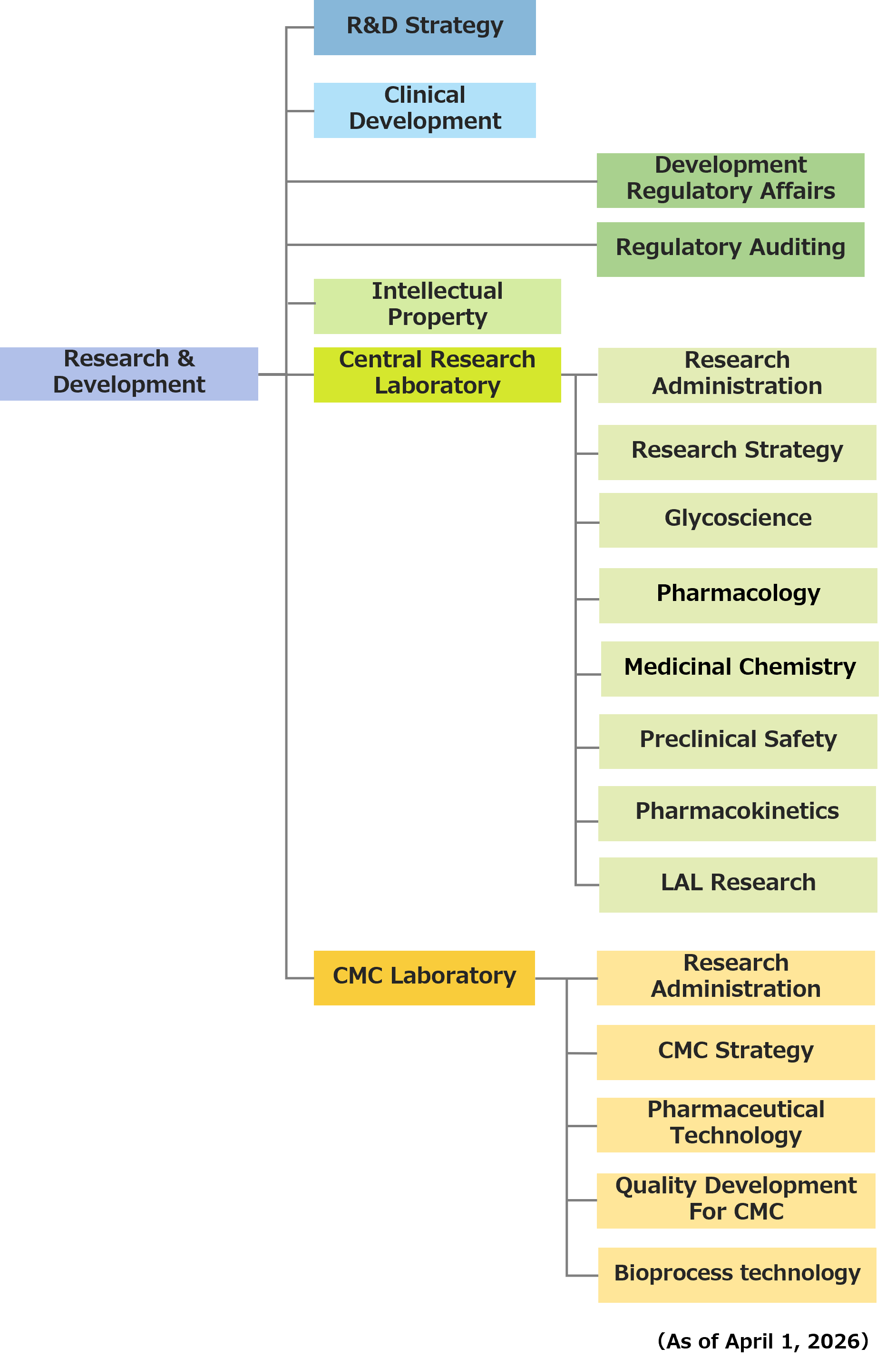 To ensure close coordination of the drug development process from its upstream to downstream, Seikagaku has put in place an organizational structure in which the departments involved in R&D are consolidated under the control of the Research & Development Division.