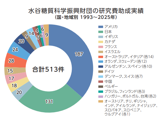 公益財団法人 水谷糖質科学振興財団は、糖質科学の振興、発展を通じて人類の福祉に貢献することを目的に、水谷當稱(元 生化学工業社長)の出捐金をもとに1992年に設立されました。以来、国内外における糖質科学研究者への研究助成や、糖質関連学会の開催支援などを行っています。2025年3月期は、16件の助成対象者に対し、総額6,699万円の研究助成を行いました。当社は、同財団の趣旨に賛同し、設立時より継続的にその活動を支援しています。